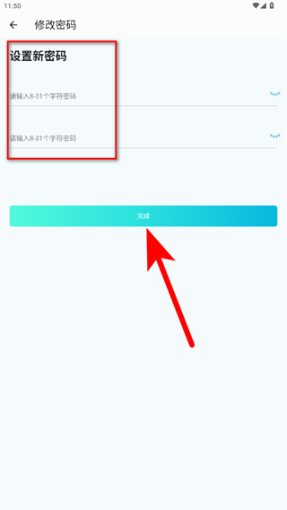 4、在密碼修改頁(yè)面中輸入8-31個(gè)字符的新密碼,再次確認(rèn)后點(diǎn)擊完成,完成密碼修改操作。