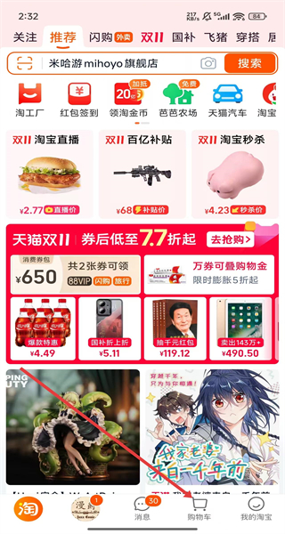 1、在淘寶首頁中,可以點(diǎn)擊底部消息按鈕,進(jìn)入查看。