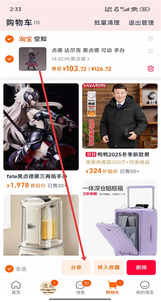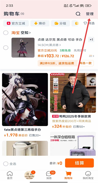 2、在進(jìn)入到購物車中,可以點(diǎn)擊右上方管理按鈕,進(jìn)行管理操作。