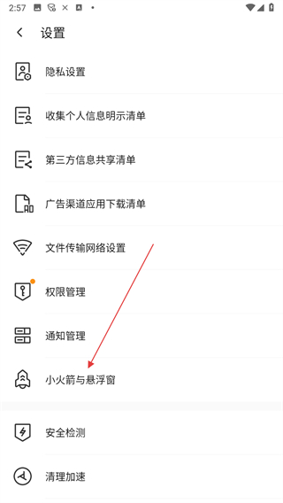 3、在設(shè)置頁面,點(diǎn)擊小火箭與懸浮窗選項。