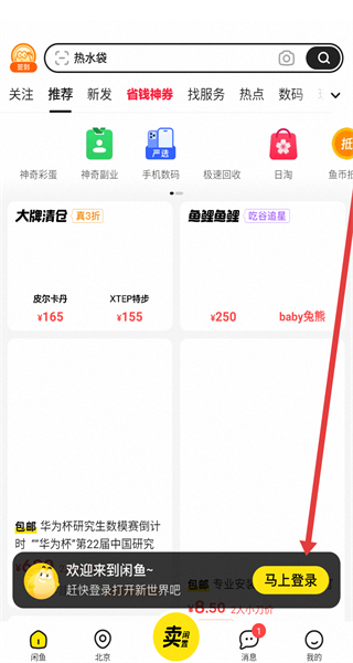 1、在閑魚首頁中,可以通過點擊下方馬上登錄按鈕,進行登錄操作。