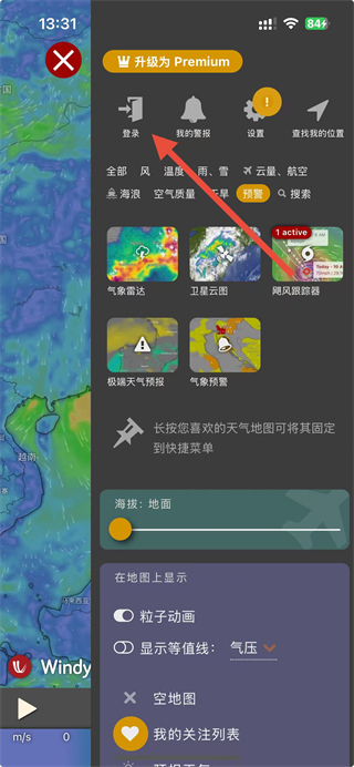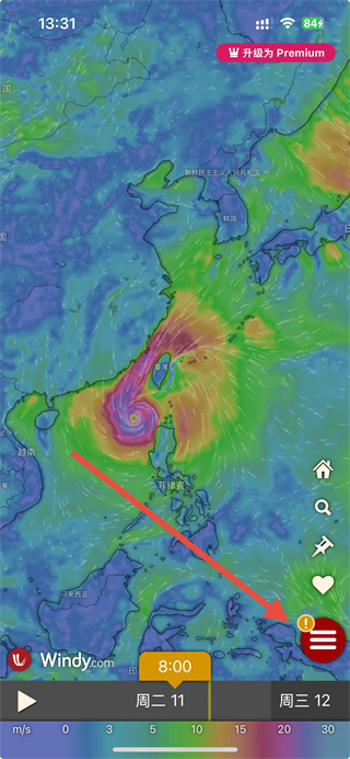 1、打開Windy app,點(diǎn)擊右下角紅色菜單按鈕,展開功能菜單。