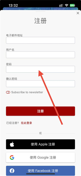 4、在注冊(cè)頁面,輸入電子郵件地址、用戶名、密碼并確認(rèn)密碼,勾選相關(guān)選項(xiàng)后點(diǎn)擊注冊(cè)按鈕完成賬號(hào)注冊(cè)。