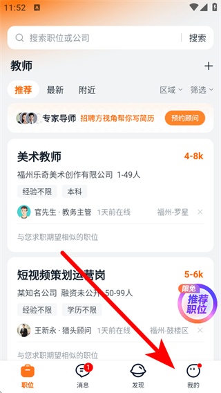 1、在職位的頁面,需要點擊底部我的按鈕,進入個人的頁面。