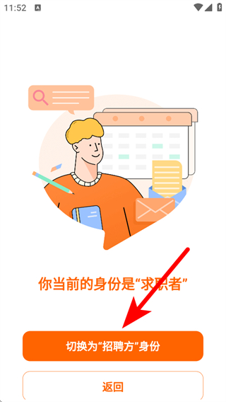 3、彈出身份提示頁面后,點擊切換為招聘方身份按鈕,即可完成身份切換。