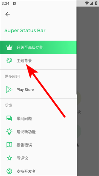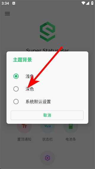 3、在主題背景選擇框中,點擊深色選項,即可開啟超級狀態(tài)欄深色模式。