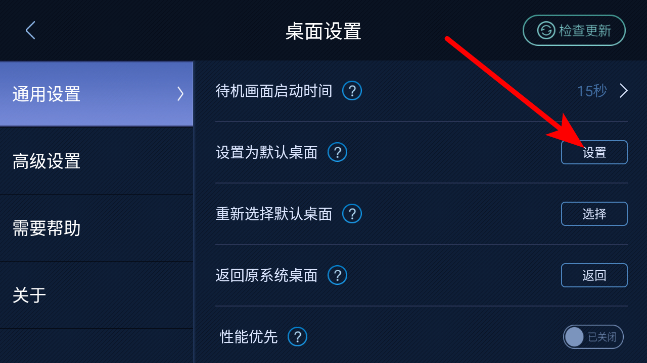 3、在桌面設(shè)置界面,點(diǎn)擊設(shè)置為默認(rèn)桌面后的設(shè)置按鈕,彈出應(yīng)用選擇窗口。