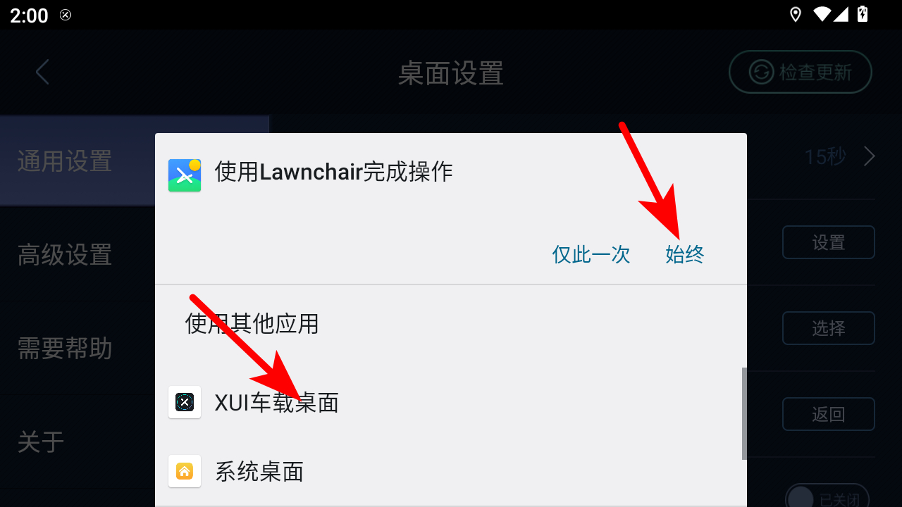4、在應(yīng)用選擇窗口中,選擇XUI車載桌面后點(diǎn)擊始終選項(xiàng),即可將其設(shè)置為默認(rèn)桌面。