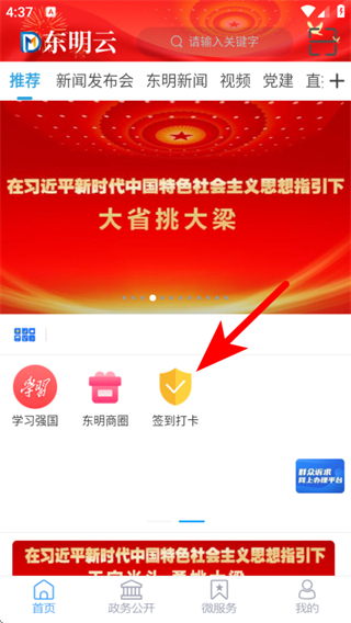 1、打開東明云app,在首頁點擊簽到打卡,進入簽到打卡頁面。