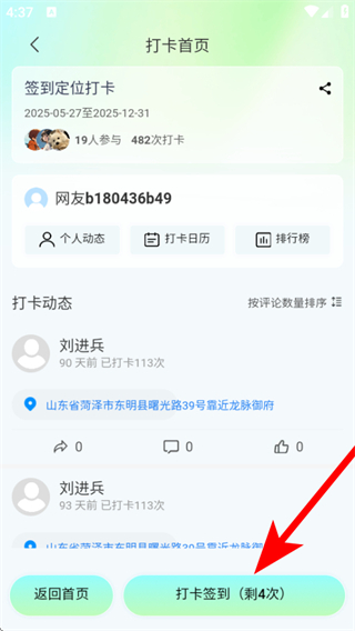 3、在打卡的首頁,需要點擊打卡簽到剩4次按鈕,進入打卡頁面。