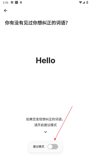 4、將建議模式右側(cè)的開(kāi)關(guān)按鈕打開(kāi)即可。