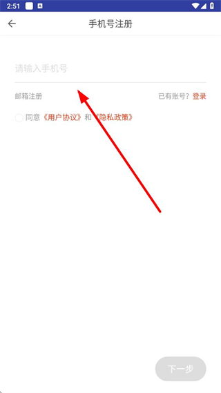 4、在手機(jī)號(hào)注冊(cè)頁(yè)面,輸入手機(jī)號(hào),勾選同意用戶(hù)協(xié)議,點(diǎn)擊下一步按提示完成注冊(cè)。