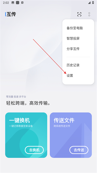 1、打開手機(jī)上的互傳應(yīng)用,點擊主界面右上角的三點圖標(biāo),在彈出的菜單中選擇備份至電腦選項。