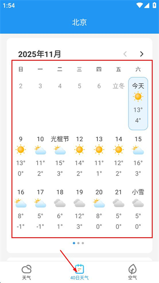 4、點擊40日天氣,查看2025年11月北京的天氣日歷。