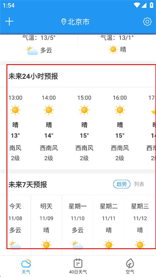 3、在天氣頁面查看未來24小時預(yù)報和未來7天預(yù)報。