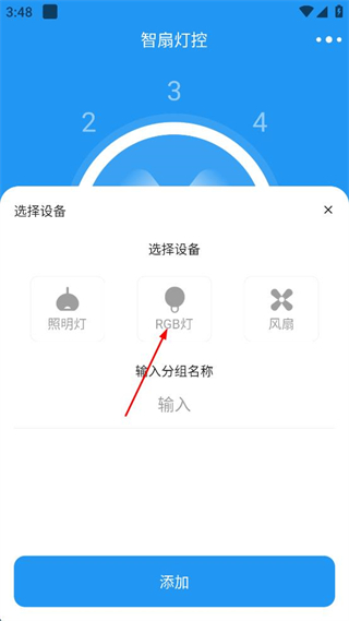 2、在彈窗中選擇“RGB燈”設(shè)備,輸入分組名稱,點(diǎn)擊“添加”按鈕,完成設(shè)備添加。