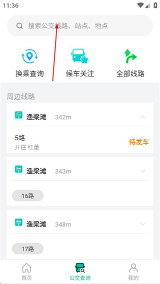 “首頁”可搜索線路、站點、地點,并可快捷進入換乘查詢、候車關(guān)注、智能客服、公交新聞,查看熱點資訊和公交公告信息。