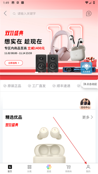 1、打開漫步者購物APP,點擊底部導航欄最右側(cè)的我的,進入個人中心頁面。