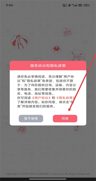 1、點擊“服務(wù)協(xié)議和隱私政策”彈窗的“同意”,進入日淘任意門APP主界面。