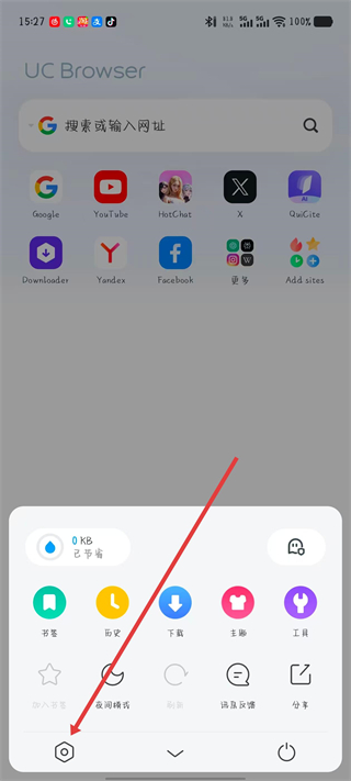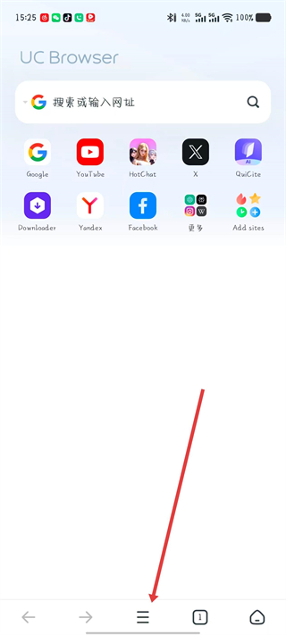1、打開UC瀏覽器國際版軟件進入主界面,點擊底部導(dǎo)航欄中類似三條橫線的菜單按鈕,展開更多功能選項。