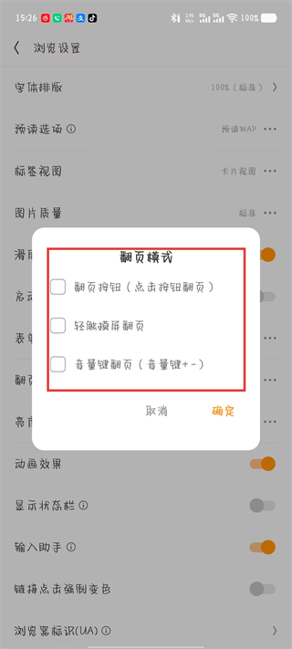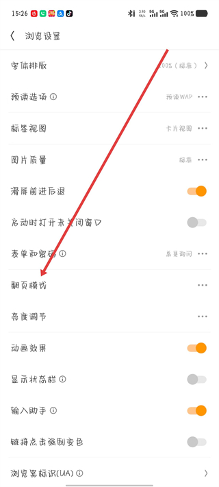 4、在瀏覽設(shè)置頁面,點擊翻頁模式選項。