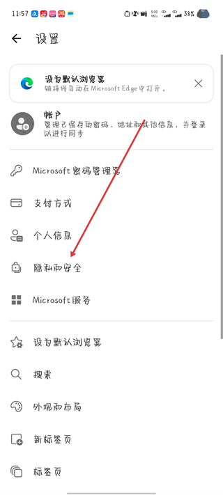3、在設置頁面,點擊隱私和安全選項。