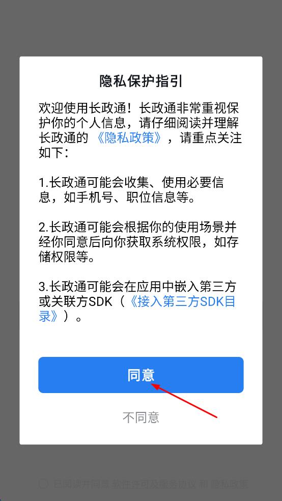 1、打開長(zhǎng)政通,會(huì)出現(xiàn)隱私保護(hù)指引界面,仔細(xì)閱讀后點(diǎn)擊“同意”。