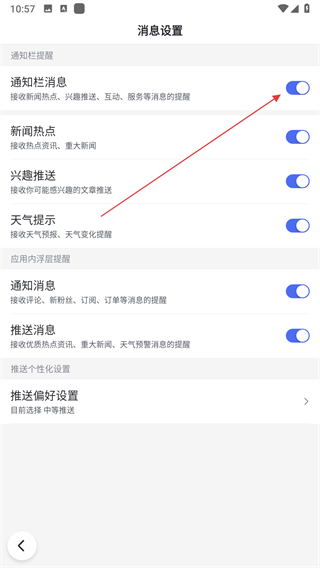 4、找到通知欄消息選項(xiàng),點(diǎn)擊開關(guān)將其關(guān)閉。
