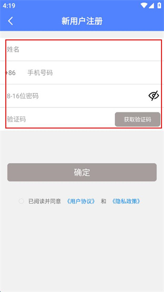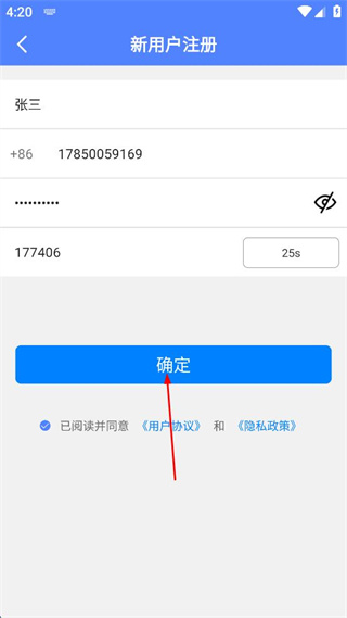 3、勾選已閱讀并同意用戶(hù)協(xié)議和隱私政策,點(diǎn)擊確定按鈕完成注冊(cè)。