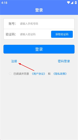 1、打開(kāi)APP登錄頁(yè)面,點(diǎn)擊注冊(cè)選項(xiàng)進(jìn)入新用戶(hù)注冊(cè)界面。
