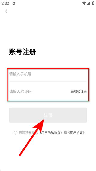 4、在賬號注冊的頁面,輸入手機號和驗證碼后,點擊注冊完成操作。
