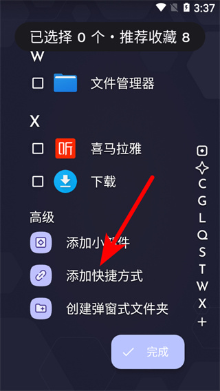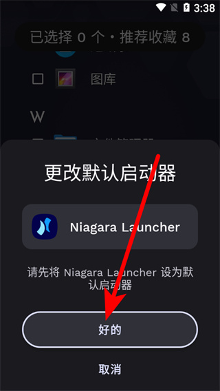 1、在Niagara Launcher應(yīng)用列表頁面,點(diǎn)擊添加快捷方式選項(xiàng),彈出更改默認(rèn)啟動(dòng)器提示框。