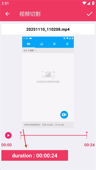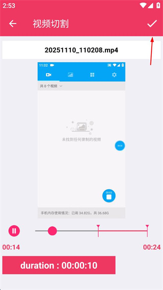4、切割完成后,點(diǎn)擊右上角的確認(rèn)按鈕,完成視頻切割。