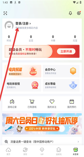 1、在咪咕游戲APP首頁(yè)點(diǎn)擊右下角“未登錄”,進(jìn)入個(gè)人頁(yè)面。