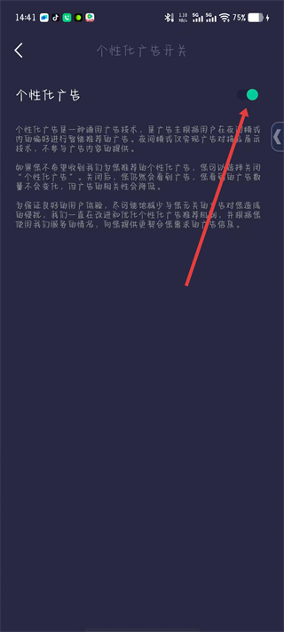 4、在個性化廣告開關頁面,點擊右側的開關。