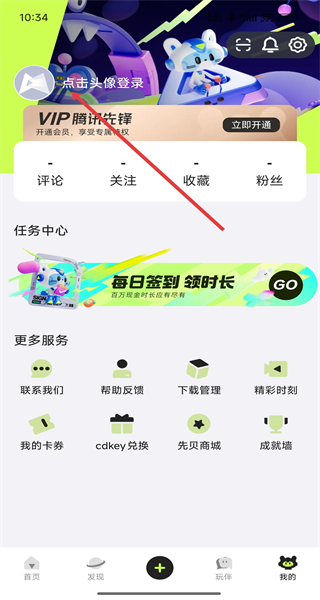 2、個(gè)人中心頁面點(diǎn)擊“點(diǎn)擊頭像登錄”,進(jìn)入騰訊先鋒登錄頁面。
