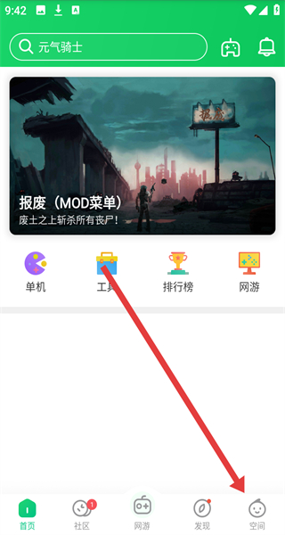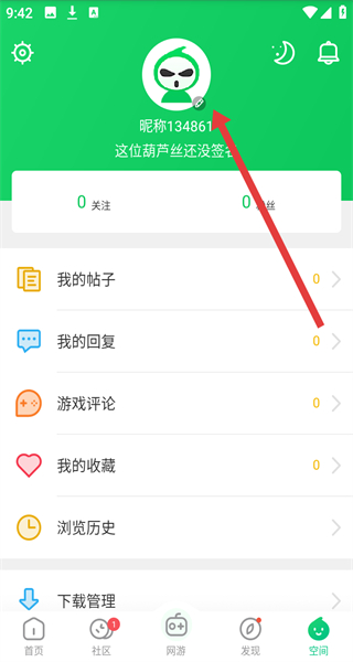 1、在游戲平臺首頁點擊右下角“空間”,進入個人空間頁面。