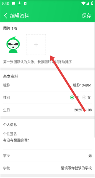 4、編輯資料頁面可以點擊箭頭指向區(qū)域進行添加頭像,在添加后點擊“保存”進行資料編輯修改。