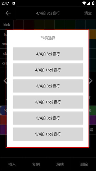 2、在節(jié)奏編輯頁面點擊4/4拍8分音符,選擇所需的節(jié)奏類型。