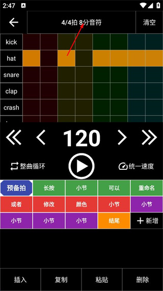 個人或樂隊在演奏樂器時,本app可以充當鼓手的作用。新建“整曲節(jié)奏”,點擊網(wǎng)格添加鼓點音符,即可按順序播放或循環(huán)播放。