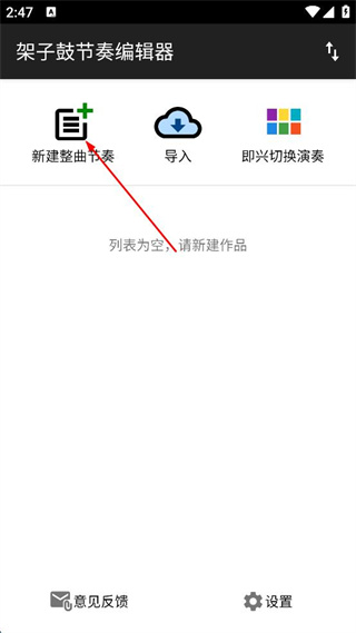1、打開架子鼓節(jié)奏編輯器,點擊新建整曲節(jié)奏,進入節(jié)奏編輯頁面。