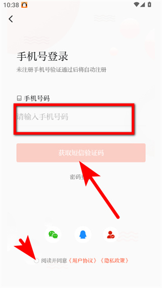 3、輸入手機(jī)號(hào)碼,勾選閱讀并同意《用戶協(xié)議》《隱私政策》后點(diǎn)擊獲取短信驗(yàn)證碼。