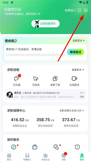 1、打開趕集招聘APP,在我的頁面點擊右上角設(shè)置圖標(biāo)。