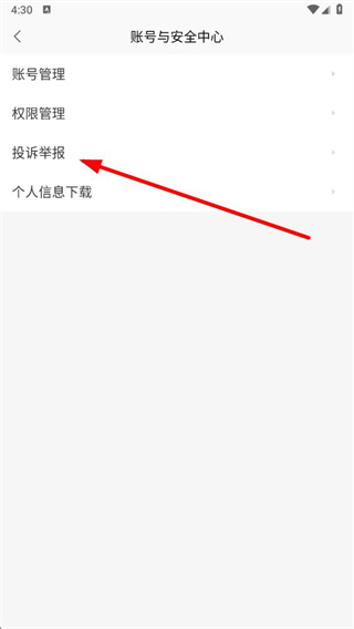 3、在賬號與安全中心頁面,點擊投訴舉報選項。