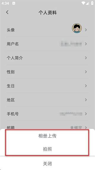 4、在菜單中選擇相冊上傳或拍照,按照提示完成頭像更換操作。