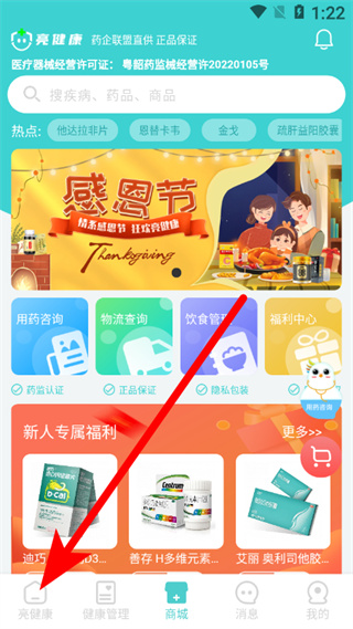 3、商城頁面有用藥咨詢、物流查詢、飲食管理、福利中心等功能板塊,還有新人專屬福利區(qū)域,展示各類優(yōu)惠健康商品。