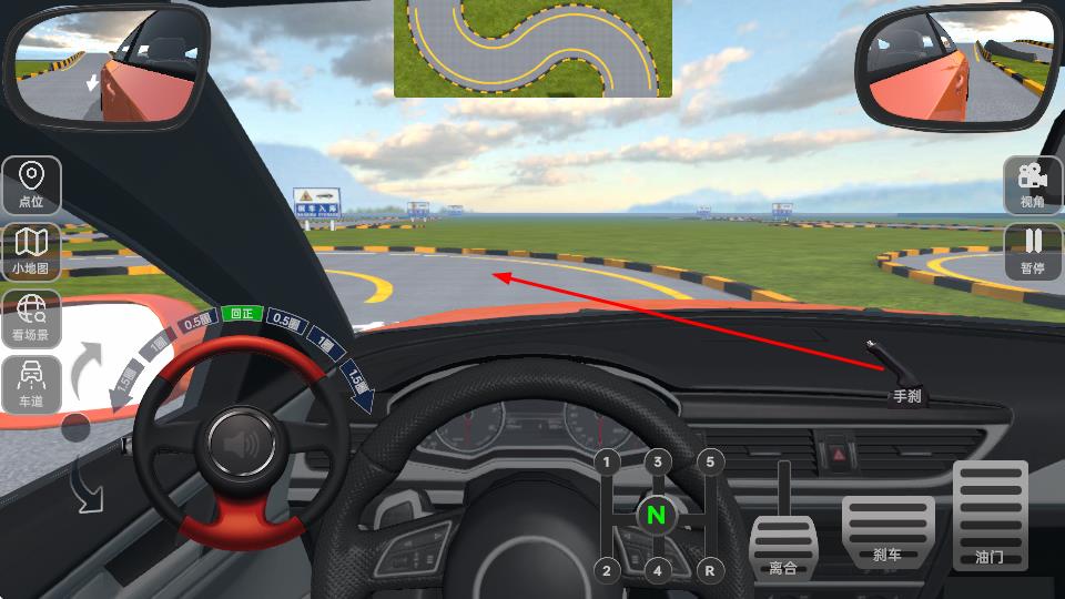 4、進(jìn)入模擬駕駛界面,通過操作屏幕上的方向盤、離合、剎車、油門等虛擬控件,進(jìn)行模擬駕駛練習(xí)。