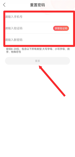 3、在密碼重置頁面,依次輸入手機號碼等信息后,點擊重置完成找回。