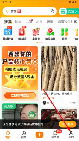 登錄一畝田客戶端,在“我要買”、“我要賣”、“發(fā)現(xiàn)”頁(yè)面,均有“全國(guó)行情”選項(xiàng),進(jìn)入后可直接查看相關(guān)貨品的行情信息。
