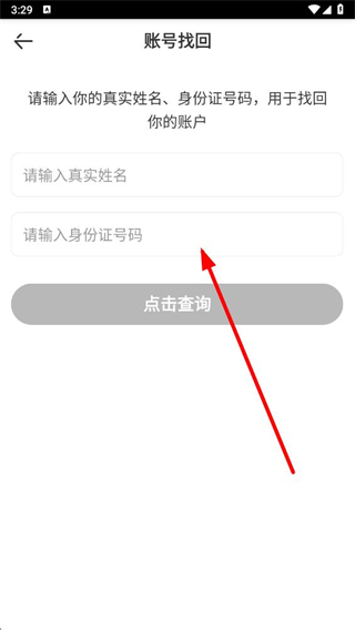 4、在賬號(hào)找回頁(yè)面,輸入真實(shí)姓名和身份證號(hào)碼,點(diǎn)擊查詢按鈕,按照提示完成賬號(hào)找回操作即可。